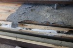 Och det var nog bra att vi rev ut det… för golvet var dåligt på sina ställen. Det har ju läckt vatten där tidigare, vilket vi märkte av nu. Sen under skåpen som diskbänken låg på, hade de gjutit fast avloppsöreret i golvet. Bra lösning tyckte de säkert då. Men det tycker inte vi var någon toppen lösning. Så förmodligen blir det till att lägga nytt golv.