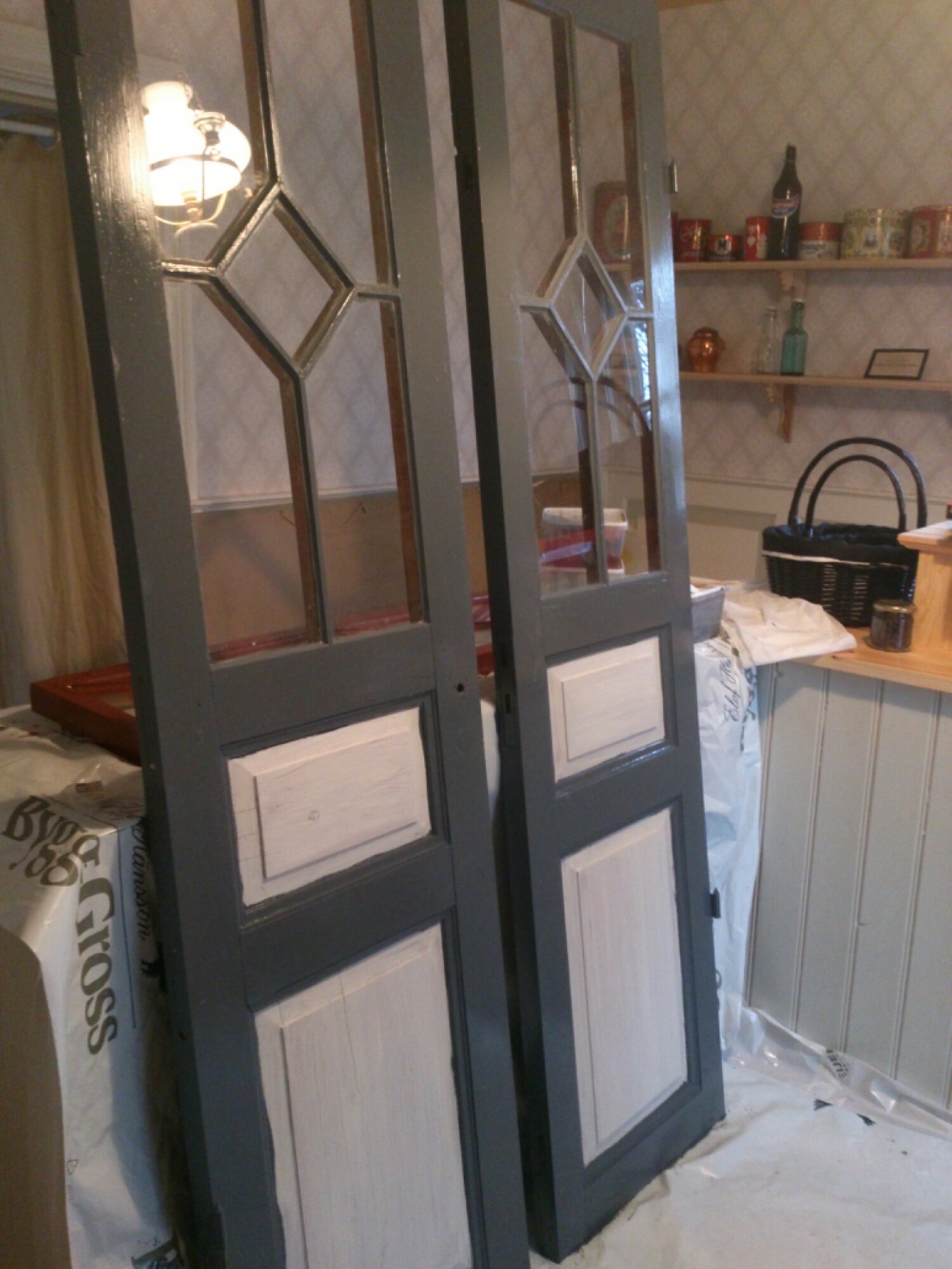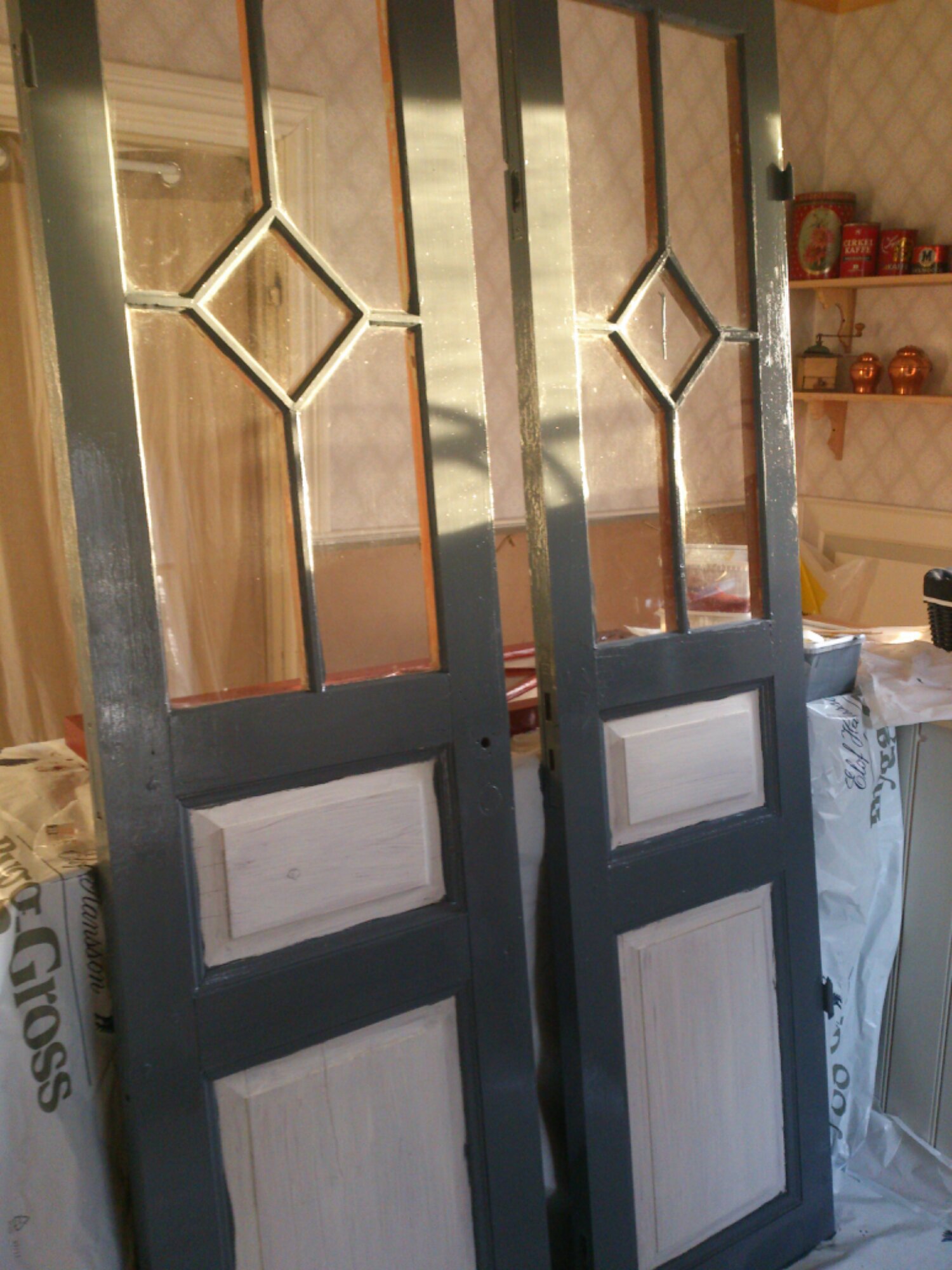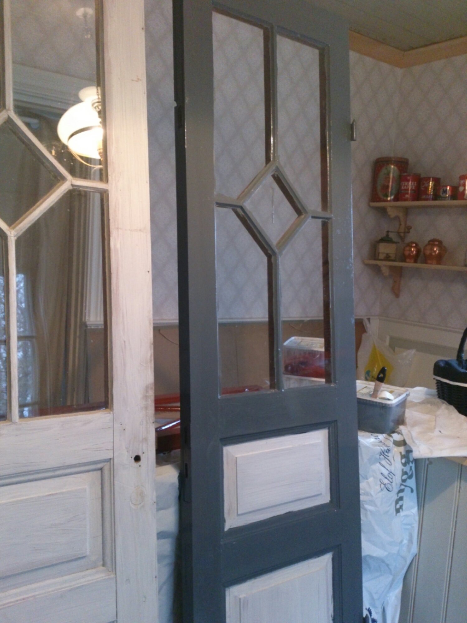 Har varit en stund och grejat nere i skolan nu på eftermiddagen. Erik har fortsatt med väggen till toaletten, det blir pärlspont. Jag har börjat måla pardörrarna som sitter i skolsalen. Vi tog ner dem och satte upp en skiva där istället. Kommer bli riktigt fint!